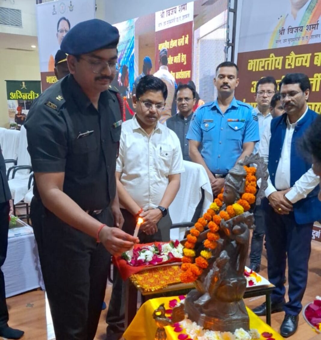 भोपाल से आए भारतीय वायु सेना सारजेंट श्री कपुल संतोष ने कहा कि छत्तीसगढ़ के युवा अपने जोश को जगाकर अग्निवीर में भर्ती हों। अग्निवीर के वायु और थल सेना की भर्ती गतिविधियों तथा सेना द्वारा दी जाने वाली सुविधाओं के संबंध में जानकारी दी। इसके आलावा मोटिवेशन वीडियो के माध्यम से युवाओं को प्रेरित किया गया। इस अवसर पर सभी जिलों के रोजगार अधिकारी और बढ़ी संख्या में युवा उपस्थित थे। भारतीय वायुसेना में भर्ती हेतु आवेदक की शैक्षणिक योग्यता 10$2/समकक्ष परीक्षा किसी भी मान्यता प्राप्त संस्था या बोर्ड से गणित, भौतिकी एवं अंग्रेजी विषयों के साथ 50 प्रतिशत अंकों के साथ एवं अंग्रेजी में 50 प्रतिशत अंक अथवा इंजीनियरिंग में 3 वर्ष का डिप्लोमा कोर्स किसी भी मान्यता प्राप्त संस्था से 50 प्रतिशत अंकों के साथ तथा अंग्रेजी में 50 प्रतिशत (मैकेनिकल/इलेक्ट्रिकल/आटोमोबाइल इल्स्ट्रूमेंटेशन इन्फोरमेशन टेक्नालॉजी) अथवा अव्यावसायिक कोर्सों के साथ 2 वर्ष का व्यावसायिक कोर्स भौतिकी या गणित विषयों में 50 प्रतिशत अंको के साथ तथा अंग्रेजी विषय में 50 प्रतिशत अंक किसी भी मान्यता प्राप्त संस्था से अथवा किसी भी मान्यता प्राप्त बोर्ड से 10$2 या समकक्ष परीक्षा 50 प्रतिशत अंकों के साथ जिसमें अंग्रेजी उत्तीर्ण होना आवश्यक है।