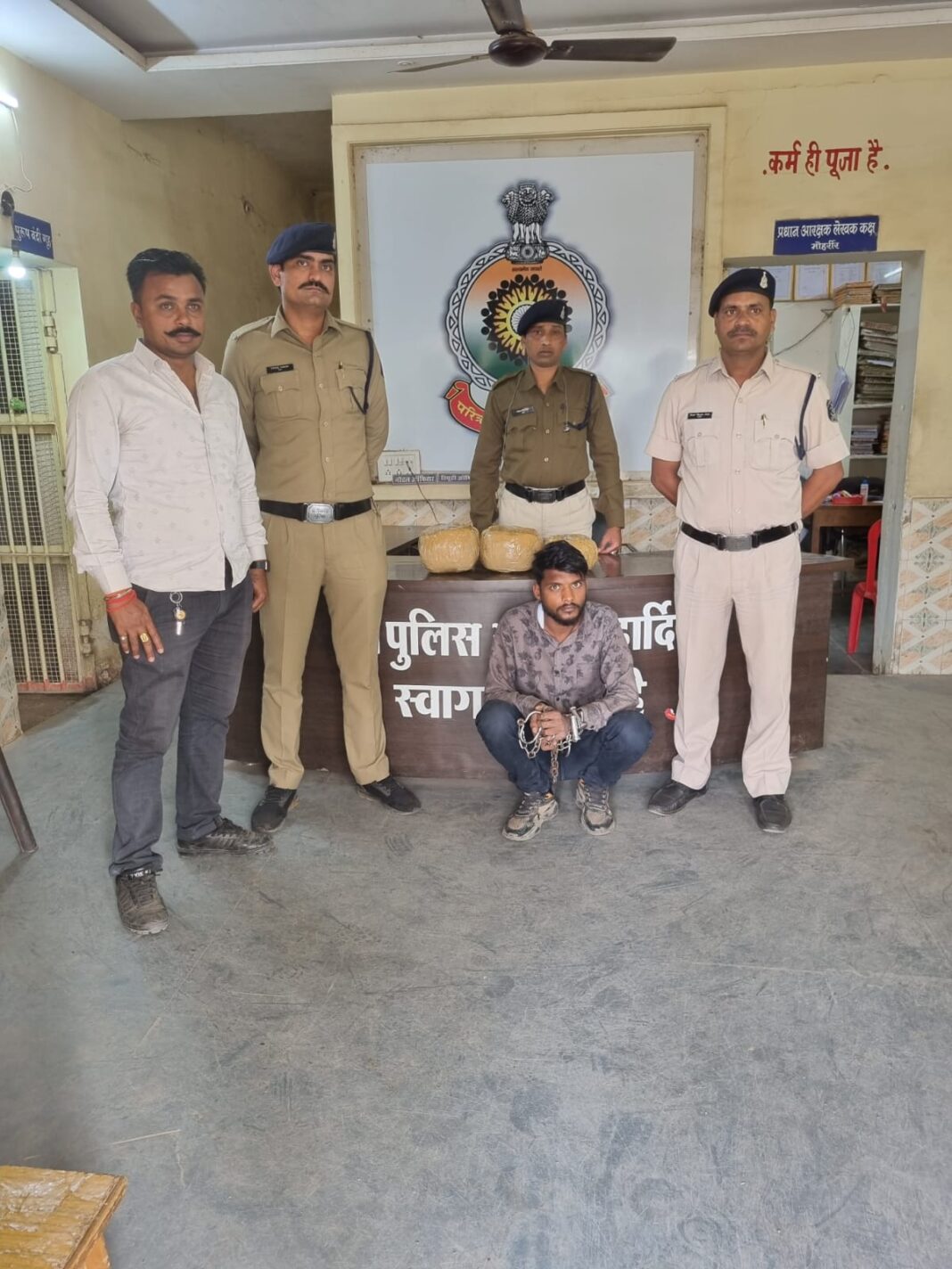 वरिष्ठ पुलिस अधीक्षक राम गोपाल गर्ग के मार्गदर्शन में, एवं अति पुलिस अधीक्षक (शहर) अभिषेक झा, तथा नगर पुलिस अधीक्षक दुर्ग मणिशंकर चन्द्रा के निर्देशन में साइबर सेल प्रभारी निरीक्षक नरेश पटेल,एवम थाना प्रभारी पुलगांव पुलिस द्वारा प्रतिबंधित गांजा बिक्री के खिलाफ अभियान प्रतिबंधित गांजा के अवैध कारोबार के खिलाफ छेड़े गये अभियान के तहत पुलगांव पुलिस को अवैध रूप से प्रतिबंधित गांजा विक्रय करने वाले को पकड़ने में सफलता प्राप्त हुयी है। अपराध से जुड़े लोग कहीं न कहीं प्रतिबंधित गांजा बेचने के आदी है। वरिष्ठ अधिकारियों के निर्देश पर गांजा का कारोबार के खिलाफ अभियान छेड़ा गया। दिनांक 10.01.2024 को डी मार्ट के पास पोटिया दुर्ग अवैध रूप से गांजा परिवहन की मुखबीर की सूचना पर घटनास्थल पहूचकर घेराबंदी कर विक्रांत उर्फ विक्की चंद्राकर पिता बसंत चंद्राकर निवासी कोणारी दुर्ग को अवैध रूप से प्रतिबंधित गांजा परिवहन करते पकडा गया जिसके कब्जे से 4.769 किलोग्राम गांजा किमती लगभग 50000/- रूपये ,एक्टिवा वाहन क्रमांक सीजी 07 AX 3565 कीमती 20000,नगदी रकम 12000रू जिसे पुलिस ने गवाहों के समक्ष विधिवत जप्त कर समय सदर में आरोपी को गिरफतार किया गया आरोपी के विरूद्ध अपराध क्रमांक 36/2024, धारा 20 (ख), एनडीपीएस एक्ट के तहत कार्यवाही कर आरोपी को ज्युडिशियल रिमाण्ड पर माननीय न्यायालय पेश किया गया। इस कार्यवाही में थाना प्रभारी पुलगांव निरीक्षक तापेश्वर सिंह नेताम,ASI पूर्णAsi पूर्ण बहादुर कार्की आरक्षक पन्नीलाल, संतोष कुमार गुप्ता, जुगनू सिंह, अनूप शर्मा, शिव मिश्रा, उपेंद्र यादव, शाहबाज खान, आरक्षक विवेक यादव ,हरीश सिन्हा, का विशेष योगदान रहा।