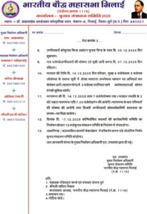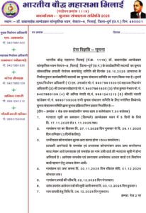 भिलाई : न्यूज़ 36 : भारतीय बौद्ध महासभा भिलाई (पं.क्र. 1119 ) डॉ. बाबासाहेब आंबेडकर सांस्कृतिक भवन सेक्टर – 6, के कार्यकारिणी सदस्यों के चुनाव कार्यक्रम की घोषणा कर दी गई है। चुनाव कार्यक्रम 17 नवंबर से शुरू होगा और मतदान व इसके उपरांत मतगणना 14 दिसंबर को है।