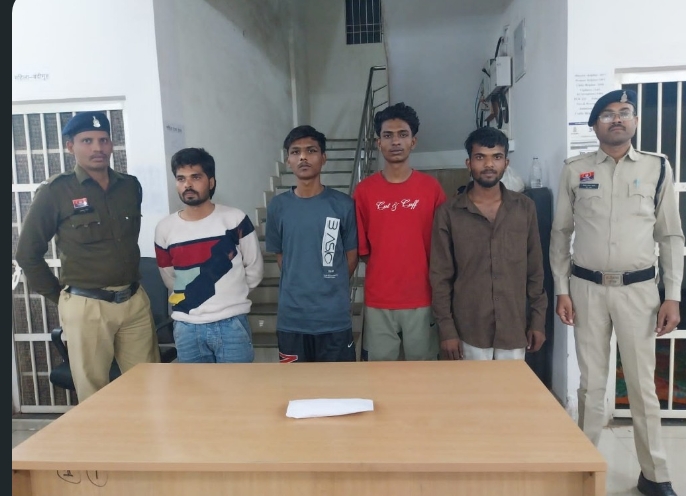 गिरफ्तार आरोपी : 1. शेखर राव (18 वर्ष), निवासी सुभाष चौक कैंप-1 भिलाई,,2. कुंदन उर्फ कुम्बज वर्मा (27 वर्ष), निवासी सुभाष चौक कोऑपरेटिव के पास भिलाई,,3. मोहम्मद सोहेल खान (28 वर्ष), निवासी संजय नगर, थाना टिकरापारा रायपुर,,4. हर्ष भट्टी, निवासी शांति नगर भिलाई