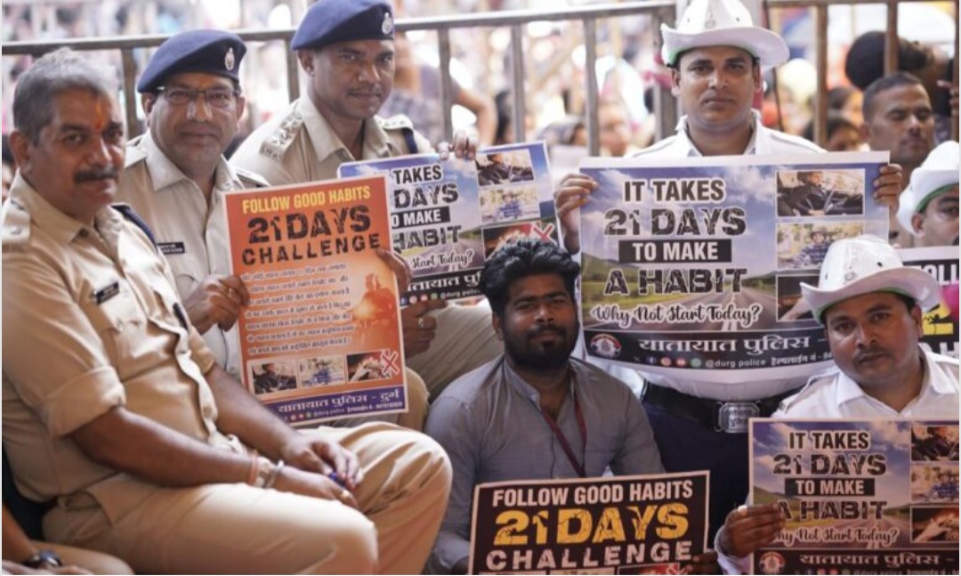 यातायात पुलिस दुर्ग के जवानों द्वारा कथा सुनने आए श्रद्धालुओं को “21 डे चैलेज” की जानकारी संबंधित पॉम्प्लेट वितरण किया गया । साथ ही दुर्ग पुलिस द्वारा विगत 21दिनों से चलाये जा रहे यातायात जागरूकता अभियान के तहत चौक चौराहे, शासकीय एवं प्राईवेट संस्था के कर्मचारी अधिकारीगण, मार्निगवॉक एवं प्ले ग्राउण्ड में आने वाले आमजन, सायं के समय परिवार के साथ पार्क जाने वाले, शॉपिंग कॉम्पलेक्स, मॉल इत्यादि जगहो पर यातायात पुलिस की मूहिम से अवगत कराते हुए बताया गया कि यदि आप 21 दिन तक लगातार दो पहिया वाहन चालन के दौरान हेलमेट लगाने और चार पहिया वाहन चालन के दौरान सीट बेल्ट लगाते हो तो 22वें दिन से वे आपके अच्छी आदत में सुमार हो जायेगाI इसके पश्चात यदि आप बिना हेलमेट एवं बिना सीट बेल्ट लगाये वाहन चलाते है तो आप स्वयं को असुरक्षित एवं असुविधाजनक महसूस करेंगे और इस तरह आपके अंदर एक अच्छी आदत सुमार हो जाती हैI की जानकारी दी गयी जिसमे लगभग 1000 लोगो इस अभियान से जुड़कर हेलमेट और सीट बेल्ट लगाने की आदत को अपनाया।