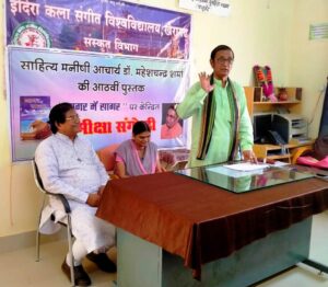 ज्ञातव्य है कि इन्दिरा कला संगीत विश्वविद्यालय खैरागढ़ एशिया का प्रसिद्ध विश्वविद्यालय है। देश-विदेश के अनेक विद्यार्थी यहां से कला और साहित्य का ज्ञान प्राप्त करते हैं। डॉ.शर्मा यहां के लिये अनेक वर्षों से, विशेष आमन्त्रित विषय विशेषज्ञ के रूप में मनोनीत हैं। उन्होंने विगत वर्ष अपनी सभी दस पुस्तकें विश्वविद्यालय ग्रन्थागार को भेंट की थी विगत वर्ष उनकी पुस्तक ” साहित्य और समाज” पर भी यहां संगोष्ठी आयोजित की गयी थी। इस कार्यक्रम में डॉ.शर्मा ने यह भी घोषणा की कि वे अपने स्मृति शेष दादा पं.मदन शर्मा के नाम से संस्कृत में सर्वोच्च अंक प्राप्त विद्यार्थी को नगद राशि से पुरस्कृत करेंगे। अन्त में संस्कृत विभाग की ओर से डॉ.पूर्णिमा केलकर ने आभार ज्ञापित किया।