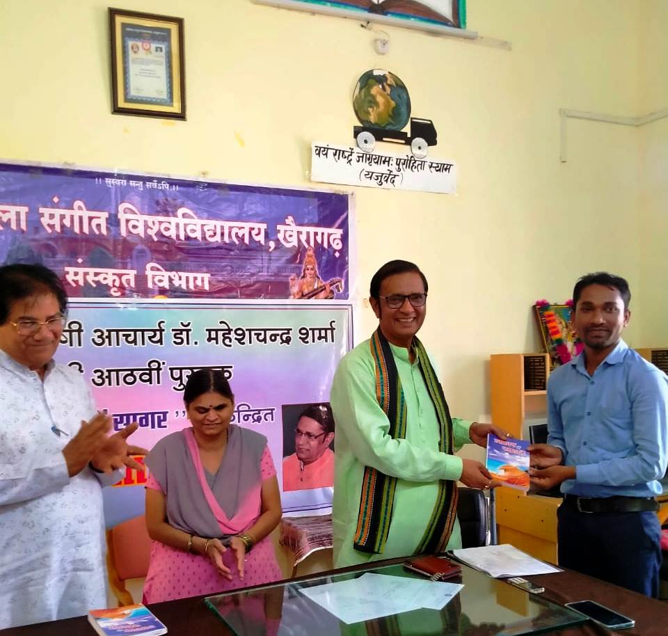 ज्ञातव्य है कि इन्दिरा कला संगीत विश्वविद्यालय खैरागढ़ एशिया का प्रसिद्ध विश्वविद्यालय है। देश-विदेश के अनेक विद्यार्थी यहां से कला और साहित्य का ज्ञान प्राप्त करते हैं। डॉ.शर्मा यहां के लिये अनेक वर्षों से, विशेष आमन्त्रित विषय विशेषज्ञ के रूप में मनोनीत हैं। उन्होंने विगत वर्ष अपनी सभी दस पुस्तकें विश्वविद्यालय ग्रन्थागार को भेंट की थी विगत वर्ष उनकी पुस्तक ” साहित्य और समाज” पर भी यहां संगोष्ठी आयोजित की गयी थी। इस कार्यक्रम में डॉ.शर्मा ने यह भी घोषणा की कि वे अपने स्मृति शेष दादा पं.मदन शर्मा के नाम से संस्कृत में सर्वोच्च अंक प्राप्त विद्यार्थी को नगद राशि से पुरस्कृत करेंगे। अन्त में संस्कृत विभाग की ओर से डॉ.पूर्णिमा केलकर ने आभार ज्ञापित किया।
