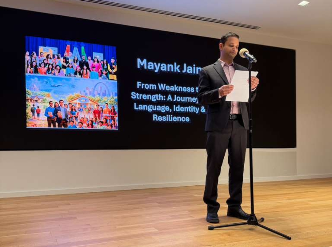 मयंक ने यहां मौजूद वैश्विक बिरादरी के समक्ष भिलाई से मिसौरी तक का सफरनामा सुनाया। उन्होंने बताया कि उनकी कहानी भारत के एक छोटे से शहर भिलाई से शुरू होती है, जहाँ हिंदी माध्यम में पढ़ाई करते हुए जीवन का सफर शुरू किया। आगे चलकर भाषा को लेकर द्वंद्व की स्थिति भी आई, जब अंग्रेज़ी के माहौल में खुद को ढालना पड़ा और कई बार उनका आत्मविश्वास भी डगमगाया। समय के साथ समझ आया कि भाषा कमजोरी नहीं, बल्कि हमारी पहचान की ताकत है। मयंक ने बताया कि उन्हें अमेरिका आने के बाद यह महसूस हुआ कि नई पीढ़ी अपनी मातृभाषा और संस्कृति से दूर होती जा रही है। इसी सोच ने हिंदी स्कूल शुरू करने की प्रेरणा दी, ताकि बच्चों को अपनी जड़ों से जोड़ने का एक मंच मिल सके। छोटे से प्रयास ने धीरे-धीरे एक सामुदायिक आंदोलन का रूप ले लिया। आज पीछे मुड़कर देखने पर महसूस होता है कि जिन चुनौतियों को कभी बोझ समझा था, वही सबसे बड़ी सीख और शक्ति बन गईं। मयंक ने कहा कि उनकी यह कहानी सिर्फ व्यक्तिगत संघर्ष की नहीं, बल्कि भाषा, पहचान और समुदाय को जोड़ने की यात्रा की कहानी है।