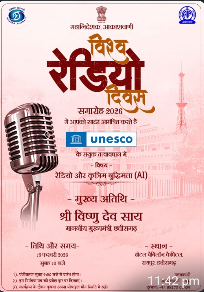रायपुर : न्यूज 36 : सूचना एवं प्रसारण मंत्रालय, प्रसार भारती और यूनेस्को के सहयोग से विश्व रेडियो दिवस का आयोजन आकाशवाणी रायपुर के द्वारा होटल बेबीलोन कैपिटल में 13 फरवरी को सुबह 10 बजे से किया जा रहा है। इस वर्ष की वैश्विक थीम “रेडियो और कृत्रिम बुद्धिमत्ता” है, जिसके अंतर्गत रेडियो प्रसारण में आर्टिफिशियल इंटेलिजेंस (AI) की संभावनाओं, चुनौतियों और नैतिक पहलुओं पर विस्तृत विचार-विमर्श किया जाएगा।