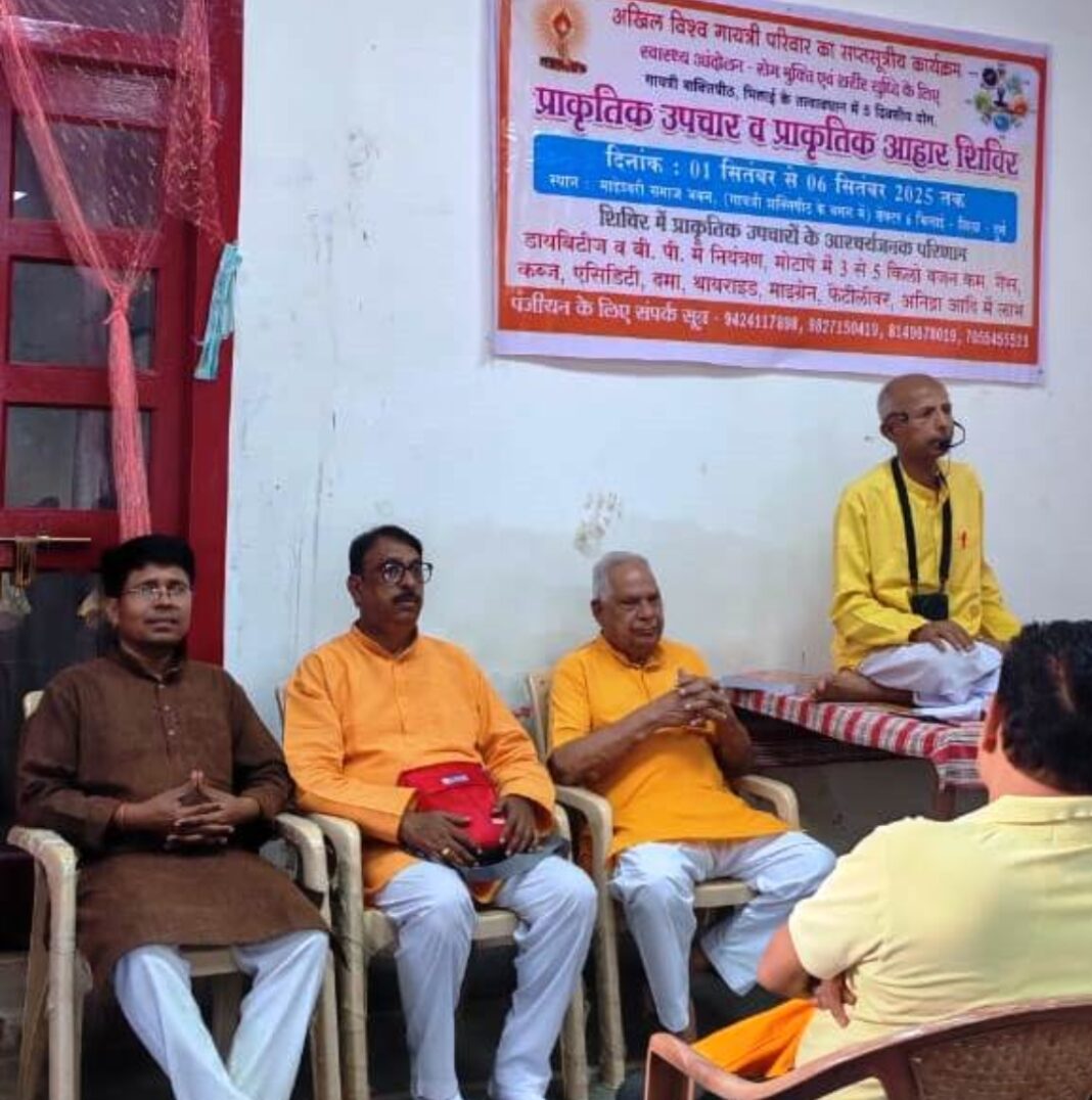 भिलाई : न्यूज़ 36 : इस्पात नगरी भिलाई में गायत्री परिवार की ओर से प्राकृतिक उपचार एवं आहार शिविर का आयोजन सेक्टर-6 स्थित माहेश्वरी भवन में किया गया। जिसमें शिविरार्थियों ने पूरे छह दिन तक रह कर प्राकृतिक उपचार एवं आहार के माध्यम से निरोगी काया प्राप्त करने की दिशा में प्रयास किया। समापन समारोह में शिविरार्थियों को संबोधित करते हुए गायत्री शक्तिपीठ के प्रमुख प्रबंध ट्रस्टी वासुदेव शर्मा ने कहा कि अखिल विश्व गायत्री परिवार के सप्त सूत्रीय कार्यक्रम के तहत स्वास्थ्य संवर्धन हम सभी के लिए महत्वपूर्ण हैं और यह उपचार दैवीय चिकित्सा है।
