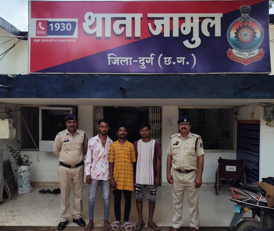 भिलाई : न्यूज़ 36 : जामुल थाना पुलिस ने त्वरित कार्रवाई करते हुए की घटना में पर्स और मोबाइल लूटने वाले तीन आरोपियों को गिरफ्तार किया है। आरोपियों ने शराब पीने के लिए पैसे मांगने से मना करने पर युवक से मारपीट कर पर्स और मोबाइल लूट लिया था। मिली जानकारी के अनुसार, प्रार्थी राकेश चौहान (निवासी लेबर कैंप जामुल) ने रिपोर्ट दर्ज कराई कि 16 सितम्बर की रात करीब 10.30 बजे वह अपने दोस्त से मिलने घासीदास नगर गया था। वहां 3-4 युवकों ने उससे 100 रुपये की मांग की। पैसे न देने पर आरोपियों ने उसकी पिटाई कर दी और पर्स व मोबाइल छीनकर फरार हो गए। पुलिस ने मामले को गंभीरता से लेते हुए प्रार्थी के बताए हुलिए, मुखबिर सूचना और सीसीटीवी फुटेज के आधार पर घेराबंदी की। इस दौरान संदेही दीपक साहू, नीरज ठाकुर और रिवाश हरपाल उर्फ पिलाबो, तीनों निवासी घासीदास नगर को गिरफ्तार किया गया। आरोपियों से नगदी 650 रुपये और माइक्रोमैक्स मोबाइल (कीमत 20,000 रुपये) बरामद किया गया।