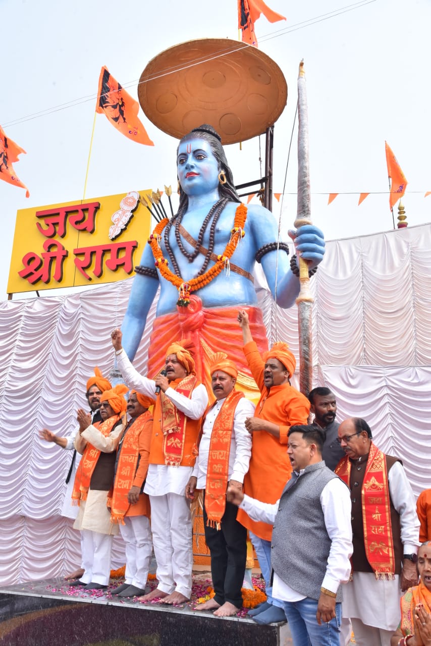 जामुल:- नगर पालिका जामुल सुरडुंग क्षेत्र में जय श्री राम हर हर महादेव के गगनभेदी जयकारे के साथ जामुल नपा अध्यक्ष ईश्वर सिंह ठाकुर के नेतृत्व में हजारों की संख्या में कलश लिये महिलाओं ने नगर में डीजे के साथ भव्य विशाल शोभा यात्रा निकाली । आयोध्या में आज श्री राम लला के नये मंदिर के विराजमान कार्यक्रम के अवसर पर नगर पालिका जामुल के संतोषी चौक एवं सुरडुंग में भगवान राम के सोलह फीट ऊंची प्रतिमा एवं भगवान शिव के विशाल प्रतिमा का अनावरण किया गया । कार्यक्रम के मुख्य अतिथि राकेश पाण्डेय प्रदेश कार्य समिति सदस्य भाजपा, अध्यक्षता राजमहंत डोमन लाल कोर्सेवाड़ा विधायक अहिवारा ने किया स्वागत भाषण में नपा अध्यक्ष ईश्वर सिंह ठाकुर ने कहा कि आज हमारे नगर के प्रमुख स्थलों में हमारे अराध्य देव भगवान श्री राम एवं भगवान शिव के प्रतिमाओं का अनावरण हमारे अतिथियों द्वारा किया गया कार्यक्रम में आप सबकी भारी संख्या में उपस्थिति बता रही है कि श्री राम एवं भगवान शिव का हम सबके मन में कितनी श्रद्धा एवं भावना है । आप सभी उपस्थित माताओं बहनों एवं हमारे बड़े बुजुर्ग भाई मित्रों का इस धार्मिक कार्यक्रम में भाग लेने के लिए मैं सादर नमन समर्पित करता हूं ।