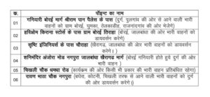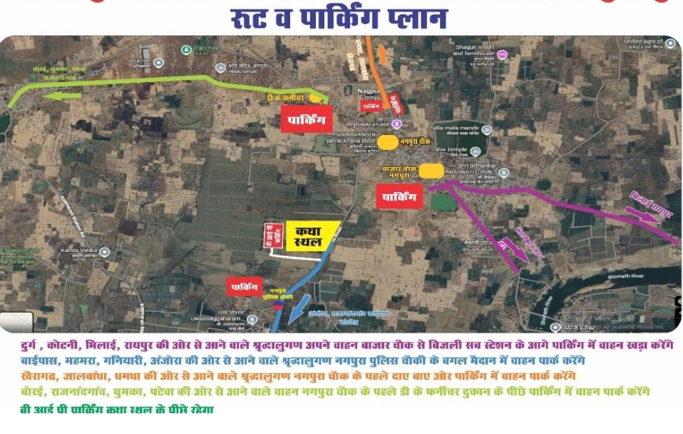 यातायात पुलिस ने बताया कि गनियारी बोरई मार्ग श्रीराम पान पैलेस के पास दुर्ग,पुलगांव की ओर से आने वाली भारी वाहनों को ग्राम बोरई ,घुमका, ठेलका डीह, राजनांदगांव की ओर से भेजा जाएगा। हरिओम किराना स्टोर के पास ग्राम बोरई तिराहा की ओर से भारी वाहनों को डायवर्सन करेंगे। सृष्टि इंजीनियर के पास चौराहा पर भारी वाहनों को डायवर्सन किया जाएगा। शनि मंदिर अंजोरा मोड नगपुरा ,जल बांधा, खैरागढ़ मार्ग की ओर से भारी वाहनों का आवागमन रखा जाएगा। चिखली चौक, धमधा रोड से कार्यक्रम की ओर किसी भी प्रकार की भारी वाहन को प्रतिबंधित रखा जाएगा। रावण भाठा चौक नगपुरा की ओर से भारी वाहनों को दुर्ग की ओर डायवर्सन करेंगे दुर्ग, कोटनी, भिलाई, रायपुर की ओर से आने वाले श्रद्धालु गण बाजार चौक से बिजली सब स्टेशन के आगे पार्किंग में अपनी वाहनों को खड़ा करेंगे। बाईपास महमरा, गनियारी, अंजोरा की ओर से आने वाले श्रद्धालुगण नगपुरा पुलिस चौकी के बगल मैदान में वाहन पार्क करेंगे। खैरागढ़, जाल बांधा, धमधा की ओर से आने वाले श्रद्धालु गण नगपुरा चौकी के पहले दाएं बाएं और पार्किंग में वाहन पार्क करेंगे। बोरई, राजनांदगांव, घुमका, पटेवा की ओर से आने वाले वाहन नगपुरा चौक के पहले डीके फर्नीचर दुकान के पीछे पार्किंग में अपनी वाहन खड़ी करेंगे। वीआईपी पार्किंग कथा स्थल के पीछे रहेगा।