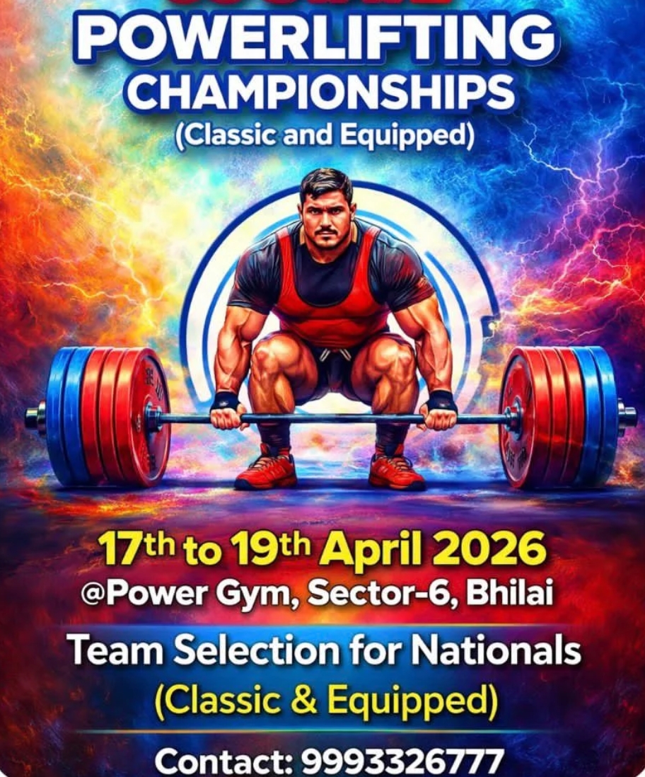 भिलाई :न्यूज़ 36 : छत्तीसगढ़ की 26वीं राज्य स्तरीय पावर लिफ्टिंग प्रतियोगिता का आयोजन 17 से 19 अप्रैल 2026 तक सेक्टर-6 स्थित पावर जिम भिलाई में किया जाएगा। यह प्रतियोगिता छत्तीसगढ़ पावर लिफ्टिंग एसोसिएशन और पावर जिम भिलाई के संयुक्त तत्वावधान में आयोजित हो रही है।