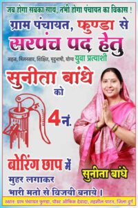 भिलाई : न्यूज़ 36 : ग्राम पंचायत फूण्डा से शिक्षित मिलनसार सरपंच पद प्रत्याशी हेतु सुनीता बांधे ने ग्राम वासियों से मांगा आशीर्वाद है,उन्होंने कहा की रुके हुए विकास के सभी कार्यों को आगे बढ़ाएंगी और गांव में मूलभूत सुविधाओं को बढ़ावा देंगी।
