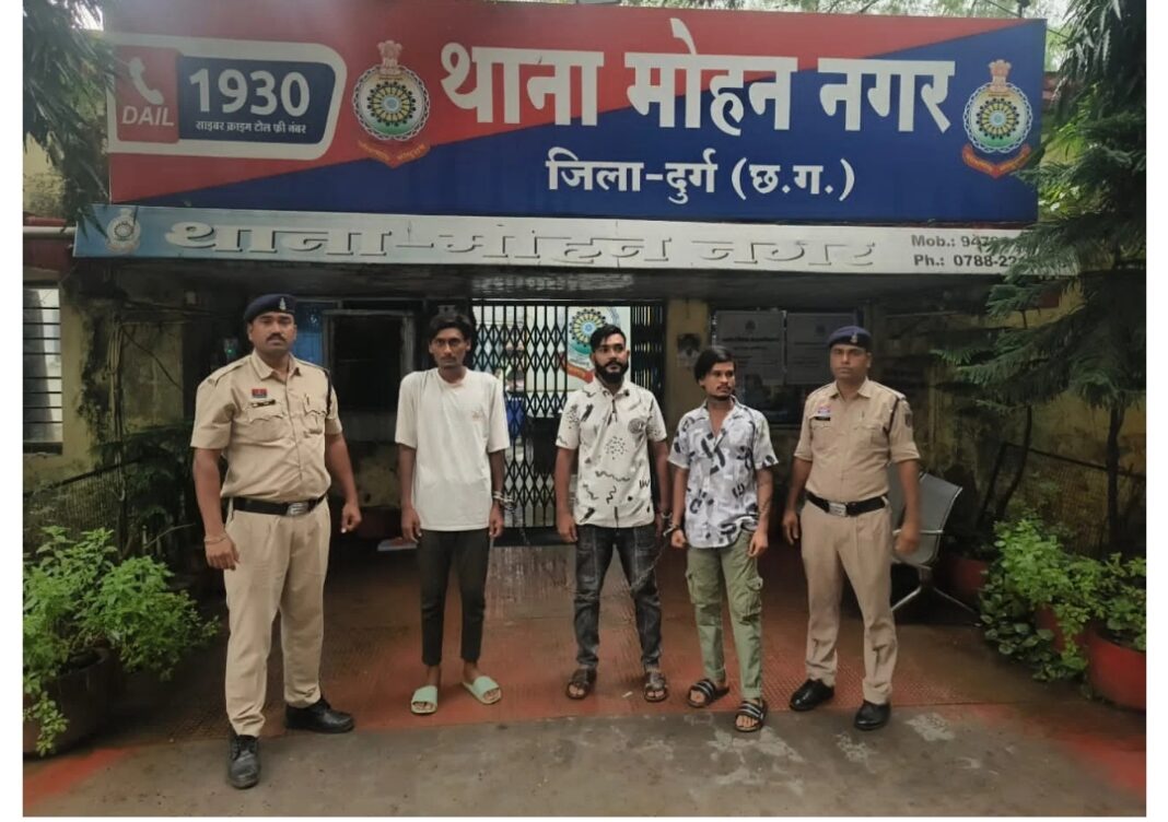 पकड़ाए आरोपी के नाम : 1. आशीष सिंह उर्फ मुज्जी कुरूद थाना जामुल। 2. लोकेश अवस्थी उर्फ लल्ली देवार मोहल्ला खुर्सीपार् । 3. अजय सोनी हाउसिंग बोर्ड थाना जामुल है।