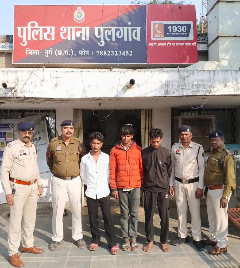 सुखनंदन राठौर अतिरिक्त पुलिस अधीक्षक दुर्ग शहर ने बताया कि ऑपरेशन विश्वास के तहत नशे के विरुद्ध कार्यवाही लगातार की जा रही है। इसी क्रम में थाना पुलगांव में 21 नवंबर को जरिये मुखबिर के सूचना प्राप्त हुई कि अभिनंदन पैलेस के पीछे रास्ते में दो व्यक्ति खड़े हैं जिन्हें एक काले रंग की स्कूटी बिना नंबर के में दो व्यक्ति थैला में गांजा रखकर दुर्ग से नदी रोड डिलीवरी करने जा रहे हैं। सूचना को गंभीरता से लेते हुये वरिष्ठ अधिकारियों के मार्गदर्शन पर थाना पुलगांव द्वारा त्वरित कार्यवाही करते हुए घेराबंदी कर संदेहियों को पुलिस अभिरक्षा मे लेकर पुछताछ करने एंव तलाशी लेने पर मादक पदार्थ गांजा मिलने पर आरोपियों के विरुद्ध पर्याप्त साक्ष्य पाये जाने से थाना पुलगांव में आरोपी वामन यादव, मुकेश वर्मा, योगेश साहू एवं एक विधि से संघर्षरात बालक से गांजा जप्त कर आरोपियों के विरुद्ध धारा 20 (ख) नारकोटिक्स एक्ट का अपराध पंजीबद्ध कर आरोपियों को विधिवत् गिरफतार कर न्यायालय के समक्ष पेश किया गया। उक्त कार्यवाही में थाना पुलगांव के पुलिस की महत्वपुर्ण भूमिका रही।