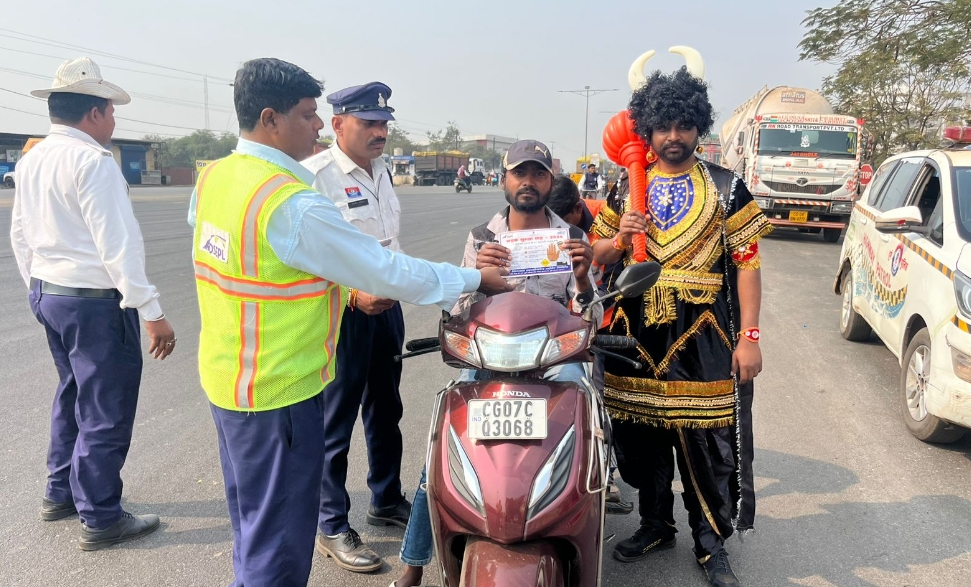 दुर्ग : न्यूज़ 36 : राष्ट्रीय सड़क सुरक्षा माह के अंतर्गत पुलिस द्वारा अनोखे अंदाज में जागरूकता कार्यक्रम का आयोजन किया गया। यमराज के कॉस्ट्यूम के माध्यम से हेलमेट, सीट बेल्ट एवं यातायात नियमों के पालन करने नागरिकों को जागरूक किया गया। नेहरू नगर चौक, गुरुद्वारा तिराहा, नेहरू नगर क्षेत्र में विशेष जागरूकता अभियान चलाया गया।