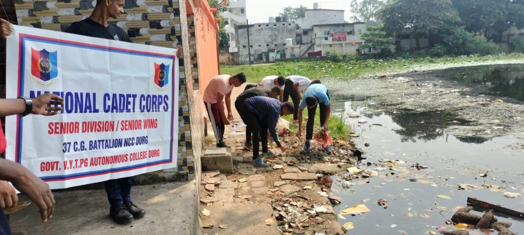 दुर्ग : न्यूज़ 36 : छत्तीसगढ़ बटालियन एन . सी. सी. दुर्ग से सम्बंधित शासकीय विश्वनाथ यादव तामस्कर स्नातकोत्तर स्वशासी महाविद्यालय दुर्ग के एन.सी.सी. अधिकारी एवं एन. सी. सी. छात्र-छात्राओं ने आज 7अक्टूबर को स्वच्छता अभियान के तहत विभिन्न कार्यक्रम चलया गया। एन.सी.सी. अधिकारी लेफ्टिनेंट प्रशांत दुबे ने बताया कि यह अभियान 37 छत्तीसगढ़ बटालियन एनसीसी के निर्देश में किया जा रहा है, जिसमें दीपक नगर वार्ड में स्थित जल निकाय को वार्ड वासियों की मदद से स्वच्छ करना, स्वच्छता रैली , पोस्टर के माध्यम से स्वच्छता का संदेश एवं स्वच्छता अभियान में अधिक से अधिक नागरिकों को शामिल करने जैसे कार्यक्रम का आयोजन किया जायेगा ।
